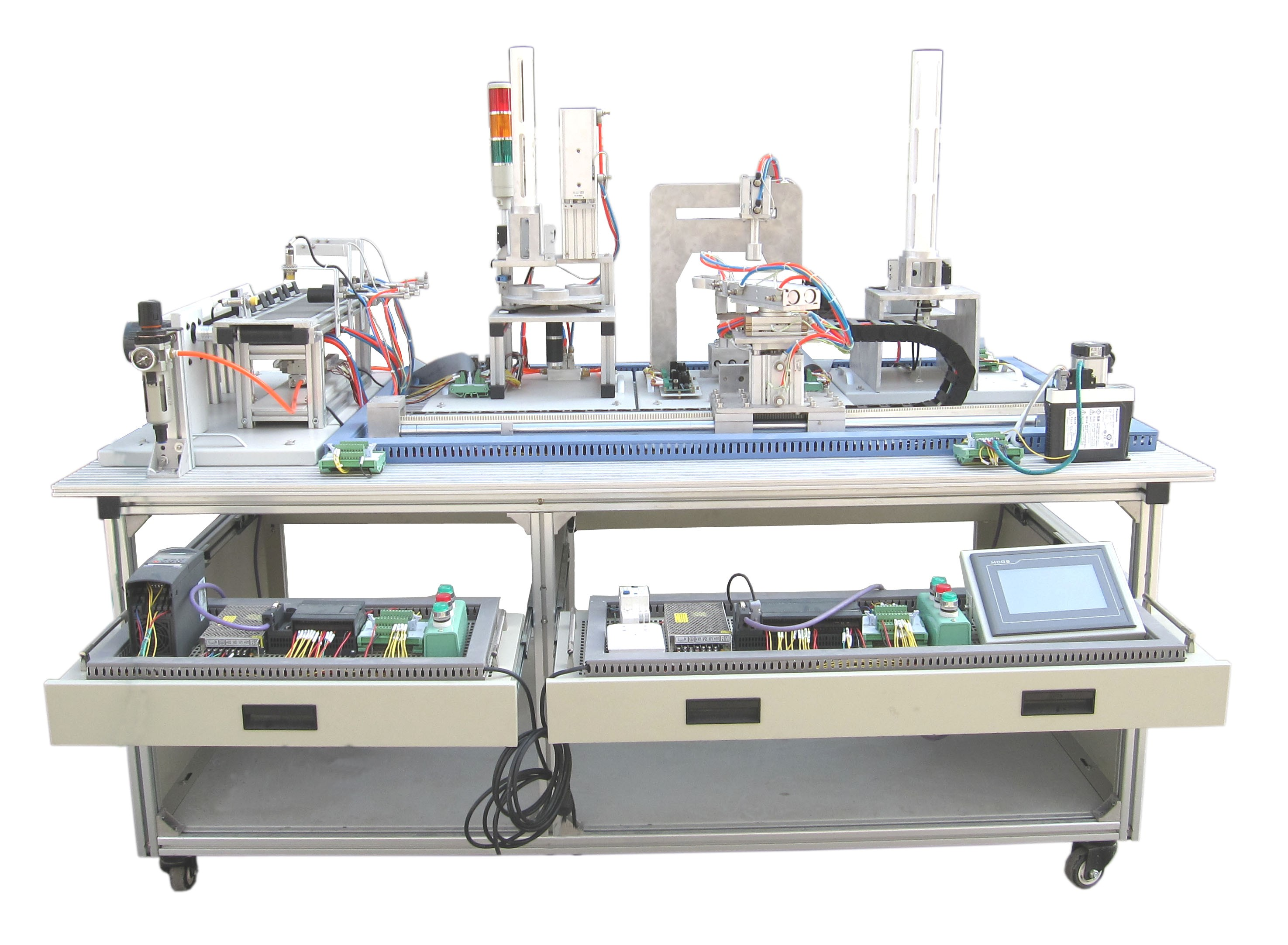 機(jī)電一體化技術(shù)實(shí)訓(xùn)設(shè)備是指機(jī)械技術(shù)、電工電子技術(shù)、微電子技術(shù)、信息技術(shù)、傳感器技術(shù)、接口技術(shù)、信號(hào)變換技術(shù)等多種技術(shù)進(jìn)行有機(jī)地結(jié)合,并綜合應(yīng)用到實(shí)際中去的技能實(shí)訓(xùn)綜合技術(shù),現(xiàn)代化的自動(dòng)生產(chǎn)設(shè)備幾乎可以說都是機(jī)電一體化的設(shè)備。自動(dòng)化生產(chǎn)線實(shí)訓(xùn)考核系統(tǒng),可以培養(yǎng)和提高學(xué)生專業(yè)綜合能力,是一種重要的實(shí)訓(xùn)設(shè)備。自動(dòng)化生產(chǎn)線實(shí)訓(xùn)系統(tǒng)、基于PLC技術(shù)的自動(dòng)化生產(chǎn)線實(shí)訓(xùn)考核系統(tǒng),可以培養(yǎng)和提高學(xué)生專業(yè)綜合能力,是一種重要的實(shí)訓(xùn)設(shè)備。自動(dòng)化生產(chǎn)線實(shí)訓(xùn)系統(tǒng)整體包括自動(dòng)供料、檢測(cè)傳輸、檢測(cè)加工、自動(dòng)裝配、自動(dòng)分揀等工序,很好的將機(jī)械技術(shù)、微電子技術(shù)、電工電子技術(shù)、傳感測(cè)試技術(shù)、接口技術(shù)、信息變換技術(shù)、網(wǎng).絡(luò)通信技術(shù)等多種技術(shù)有機(jī)地結(jié)合。該系統(tǒng)中自動(dòng)分揀站的設(shè)計(jì)過程,包括系統(tǒng)硬件設(shè)計(jì)、PLC控制設(shè)計(jì)和程序設(shè)計(jì)方法,F(xiàn)代化的自動(dòng)生產(chǎn)設(shè)備的最大特點(diǎn)是它的綜合性和系統(tǒng)性,在這里,機(jī)械技術(shù)、微電子技術(shù)、電工電子技術(shù)、傳感測(cè)試技術(shù)、接口技術(shù)、信息變換技術(shù)、網(wǎng)絡(luò)通信技術(shù)等多種技術(shù)有機(jī)地結(jié)合,并綜合應(yīng)用到生產(chǎn)設(shè)備中:而系統(tǒng)性指的是,生產(chǎn)線的傳感檢測(cè)、傳輸與處理、控制、執(zhí)行與驅(qū)動(dòng)等機(jī)構(gòu)在微處理單元的控制下協(xié)調(diào)有序地工作,有機(jī)地融合在一起。可編程序控制器(PLC)以其高抗干擾能力、高可靠性、高性能價(jià)格比且編程簡(jiǎn)單而廣泛地應(yīng)用在現(xiàn)代化的自動(dòng)生產(chǎn)設(shè)備中,擔(dān)負(fù)著生產(chǎn)線的大腦一微 處理單元的角色。因此,培養(yǎng)掌握機(jī)電一體化技術(shù),掌握PLC技術(shù)及PLC網(wǎng)絡(luò)技術(shù)的技術(shù)人材是當(dāng)務(wù)之急。而一套基于PLC技術(shù)的自動(dòng)化生產(chǎn)線實(shí)訓(xùn)考核設(shè)備可以模擬一個(gè)與實(shí)際生產(chǎn)情況+分接近的控制過程,使學(xué)習(xí)者得到一個(gè)非常接近于實(shí)際的教學(xué)設(shè)備環(huán)境,從而縮短了理論教學(xué)與實(shí)際應(yīng)用之間的距離。自動(dòng)分揀站需完成對(duì)上一單元送來的已加工、裝配的工件進(jìn)行分揀。使不同顏色的工件從不同的料槽分流的功能。當(dāng)輸送站送來工件放到傳送帶上并為入料口光電傳感器檢測(cè)到時(shí),即啟動(dòng)變頻器,工件開始送入分揀區(qū)進(jìn)行分揀。上海碩博弘揚(yáng)大國(guó)工匠精神, 發(fā)展職業(yè)教育,應(yīng)用教學(xué)設(shè)備,為企業(yè)培養(yǎng)高技能人才,而專業(yè)生產(chǎn):光機(jī)電一體化(自動(dòng)生產(chǎn)線)實(shí)訓(xùn)裝置、灌裝自動(dòng)化生產(chǎn)線實(shí)訓(xùn)裝置、工業(yè)自動(dòng)生產(chǎn)線實(shí)訓(xùn)裝置 、工業(yè)控制模擬實(shí)訓(xùn)裝置 、機(jī)電一體化組合實(shí)訓(xùn)平臺(tái) 、機(jī)電一體化綜合實(shí)訓(xùn)考核裝置、自動(dòng)化生產(chǎn)安裝與調(diào)試實(shí)訓(xùn)裝置 、光機(jī)電一體化高速分揀實(shí)訓(xùn)系統(tǒng) 、典型機(jī)電設(shè)備安裝與控制實(shí)訓(xùn)裝置、模塊式柔性自動(dòng)環(huán)形生產(chǎn)線實(shí)驗(yàn)系統(tǒng)(帶機(jī)器人工程型)、立體停車庫實(shí)物教學(xué)實(shí)驗(yàn)裝置、機(jī)電一體化柔性生產(chǎn)線加工實(shí)訓(xùn)系統(tǒng)(5站)、網(wǎng)絡(luò)型模塊式柔性自動(dòng)化生產(chǎn)線實(shí)驗(yàn)系統(tǒng)、模塊式柔性自動(dòng)環(huán)形生產(chǎn)線實(shí)驗(yàn)系統(tǒng)(工程型)、柔性生產(chǎn)制造實(shí)驗(yàn)系統(tǒng)(工程型)、現(xiàn)代物流倉(cāng)儲(chǔ)自動(dòng)化實(shí)驗(yàn)系統(tǒng)、運(yùn)動(dòng)實(shí)訓(xùn)裝置、循環(huán)搬運(yùn)自動(dòng)控制實(shí)訓(xùn)裝置、平面雙軸運(yùn)行控制實(shí)訓(xùn)裝置、工業(yè)機(jī)械手實(shí)訓(xùn)裝置、物料分揀實(shí)訓(xùn)裝置、機(jī)械手實(shí)訓(xùn)裝置 、立體倉(cāng)庫實(shí)訓(xùn)裝置、十字路口交通燈實(shí)訓(xùn)系統(tǒng)、機(jī)電液氣一體化綜合實(shí)訓(xùn)裝置、光機(jī)電一體化高速分揀實(shí)訓(xùn)系統(tǒng)、步進(jìn)伺服控制綜合實(shí)訓(xùn)平臺(tái)、光機(jī)電氣一體化控制實(shí)訓(xùn)系統(tǒng)、 光機(jī)電一體化綜合實(shí)訓(xùn)考核裝置、光機(jī)電一體化實(shí)訓(xùn)考核裝置、光機(jī)電一體化實(shí)訓(xùn)考核裝置、光機(jī)電氣一體化控制實(shí)訓(xùn)系統(tǒng)、自動(dòng)生產(chǎn)線拆裝與調(diào)試實(shí)訓(xùn)裝置、柔性自動(dòng)化生產(chǎn)線實(shí)訓(xùn)系統(tǒng)。
