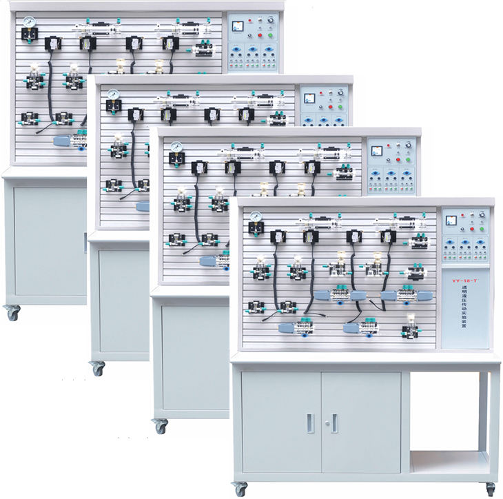 透明液壓實驗臺為實現(xiàn)液壓傳動課程現(xiàn)代化教學(xué)而進(jìn)行研究的最新科技成果,它填補(bǔ)了技校、中專、大專院校的液壓傳動透明教學(xué)設(shè)備的國家空白。液壓傳動具有重量輕、功率大、結(jié)構(gòu)簡單、布局靈活、控制方便等特點(diǎn)、速度、扭矩、功率均可作無級調(diào)節(jié),能迅速換向和變速,調(diào)速范圍寬,快速性好,工作平穩(wěn)、噪音小,元器件已實現(xiàn)系列化、標(biāo)準(zhǔn)化,通用化等一系列優(yōu)點(diǎn),隨著科學(xué)技術(shù)的發(fā)展,液壓傳動作為一種可以傳遞動力和控制的傳動方式,已經(jīng)日益廣泛應(yīng)用到醫(yī)療、科技、軍事、工業(yè)自動化生產(chǎn)、起動、運(yùn)輸、礦山、建筑、航空等各個領(lǐng)域。為了適應(yīng)在短暫課堂時間內(nèi),完成多個液壓油路的教學(xué)內(nèi)容。同時對比演示多個不同油路的工作原理。而且,使油路系統(tǒng)的安裝調(diào)試有必要的程序且不占用上課教學(xué)時間。就必須有多臺設(shè)備同時工作。同時,YY-18