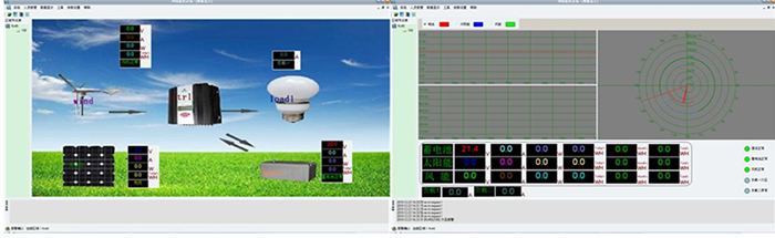 ◆ 顯示內(nèi)容:蓄電池電壓、風機電壓、光伏電壓、風機電流、光伏電流、風機功率、光伏功率,能量模擬圖,當前風速(米/秒),當前風向(度),當前風力資源平估。