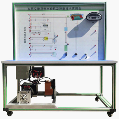 檢測控制面板(裝有各種檢測端子,1448×940mm彩色電路圖和工作原理示意圖)、組合儀表、點(diǎn)火開關(guān)、電機(jī)控制器、車載充電器與充電接口、DC-DC轉(zhuǎn)換器、鋰動力電池組、電動車電機(jī)(交流異步電動機(jī))、剎車開關(guān)、檔位開關(guān)、油門控制裝置、大電流繼電器、電源總開關(guān)、急停開關(guān)、輔助蓄電池(12V45AH)、一體化全鋁合金型材搭建的移動臺架(1500×700×1700mm (帶自鎖腳輪裝置,帶安裝檢測端子的原理面板,面板1448×940mm)、設(shè)備操作說明書。