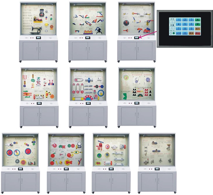 (2)展示內(nèi)容全面。該陳列柜以國家級規(guī)劃教材為依據(jù),對機(jī)械基礎(chǔ)課程內(nèi)容進(jìn)行較全面的展示,包括平面機(jī)構(gòu)應(yīng)用、凸輪、齒輪、液壓元件原理等,提供內(nèi)容豐富的機(jī)械基礎(chǔ)基本知識。對不同版本的同名教材具有兼容性;